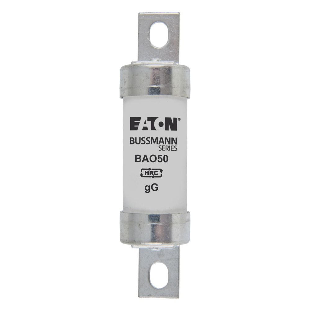 This is manufactured by Eaton. The manufacturer part number is BAO50. It has a bolted type tag . Concerning body diameter, it is 21mm. The product has a gg application category. The product has a current rating of 50a. The fuse dimensions of the product is 21 x 54mm . Moreover, the product has a nominal 550v ac voltage rating. The product bussmann, is a highly preferred choice for users. A fuse with a a3 size. It has a typical 73.5mm fixing centres . Its tag is 12.7mm wide . It has an overall length of 87mm. Moreover, its tag orientation is offset . Its body length is 54mm. Moreover, it has a high rupture capacity yes . Its body height is 22.3mm. The fuse complies with bs 88, iec 269 standards. Its overall body width is 21mm . It has typical 5 weeks of manufacturer standard lead time. Its typical moisture sensitivity level is 1 (unlimited). It is available in the standard package of 20. The eaton's product offers user-desired applications.
