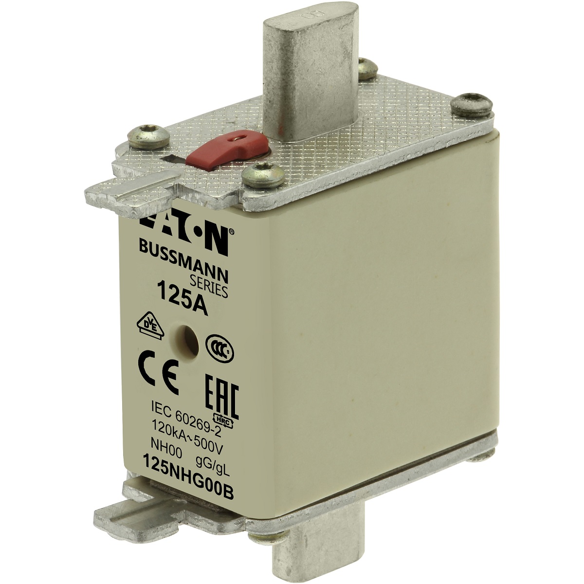 This is manufactured by Eaton. The manufacturer part number is 125NHG00B. It has a blade type tag . The product has a gg - gl application category. The product has a current rating of 125a. The fuse dimensions of the product is 79 x 30 x 58mm . Moreover, the product has a nominal 500v ac voltage rating. A fuse with a nh00 size. It has an overall length of 78.5mm. Its tag is 6mm wide . Moreover, its tag orientation is square . Its body length is 79mm. Moreover, it has a high rupture capacity yes . Its body height is 58mm. The fuse complies with din 43620-1, din 43620-3, iec 60269, vde 0636 standards. Its overall body width is 30mm . It has typical 5 weeks of manufacturer standard lead time. The product's diameters include 2.126" l x 1.181" w x 1.969" h (54.00mm x 30.00mm x 50.00mm). The splendid features of the product include indicating. The product is available in holder configuration. The product exhibits 500v of AC voltage rating. The product complies with ce, vde. It is available in the standard package of 3. Its typical moisture sensitivity level is 1 (unlimited). In addition, bulk is the available packaging type of the product. The product is widely employed in electrical, industrial. It has a 25000 melting I²t. It integrates a square fuse type. Moreover, the product comes in rectangular, blade. 250v of DC voltage rating. It responds within fast. Whereas, the breaking capacity of the product at rated voltage is 120ka. Class Information: nh. The eaton's product offers user-desired applications.