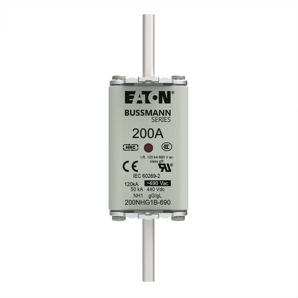 This is manufactured by Eaton. The manufacturer part number is 200NHG1B-690. The product has a gg - gl application category. The product has a current rating of 200a. The fuse dimensions of the product is 135 x 40 x 63mm . Moreover, the product has a nominal 690v voltage rating. The product eaton bussmann, is a highly preferred choice for users. A fuse with a nh1 size. It has an overall length of 135mm. Its tag is 6mm wide . Its body length is 75mm. Moreover, it has a high rupture capacity yes . Its body height is 53mm. The fuse complies with din 43620-1, din 43620-3, iec 60269-2 standards. Its overall body width is 52mm . It has typical 5 weeks of manufacturer standard lead time. The product's diameters include 2.953" l x 2.047" w x 2.165" h (75.00mm x 52.00mm x 55.00mm). The splendid features of the product include indicating. The product is available in holder configuration. The product exhibits 690v of AC voltage rating. The product complies with ce, vde. It is available in the standard package of 3. Its typical moisture sensitivity level is 1 (unlimited). In addition, bulk is the available packaging type of the product. The product is widely employed in industrial, motor protection, solar (photovoltaic). It has a 105000 melting I²t. It integrates a square fuse type. Moreover, the product comes in rectangular, blade. Whereas, the breaking capacity of the product at rated voltage is 120ka. Class Information: nh. The eaton's product offers user-desired applications.