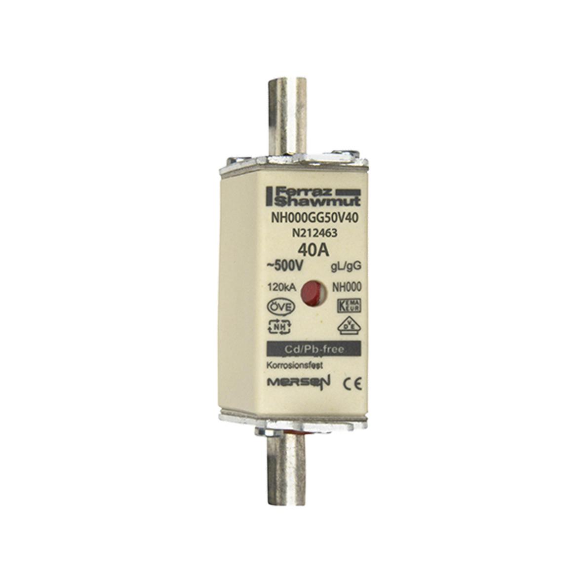 This is 40A 000 NH Centred Tag Fuse gG 500V ac manufactured by Mersen. The manufacturer part number is N212463C. Moreover, the product has a nominal 500v ac voltage rating. A fuse with a 78 x 52 x 21mm size. The product has a current rating of 40a. The fuse complies with iec standard standards.
