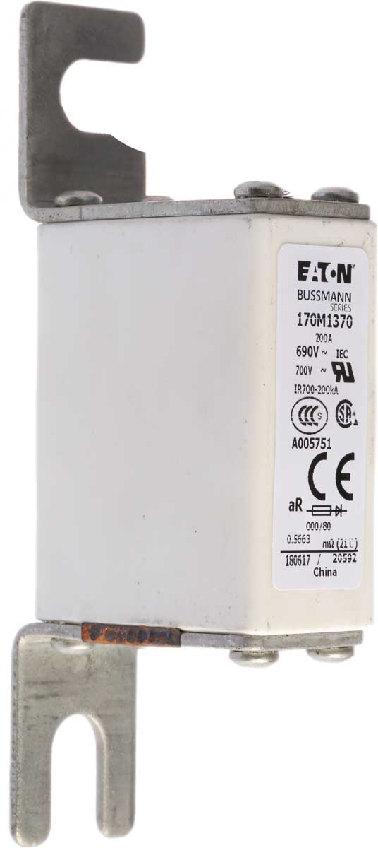 This is 200A 000 F Bolted Tag Fuse 700V ac manufactured by Cooper Bussmann. The manufacturer part number is 170M1370. It has a slotted type tag . The product has a ar application category. The product has a current rating of 200a. The fuse dimensions of the product is 54 x 21 x 40mm . Moreover, the product has a nominal 690v voltage rating. The product 170m, is a highly preferred choice for users. A fuse with a 000 size. It has a typical 78mm fixing centres . Its tag is 20mm wide . It has an overall length of 100mm. Moreover, its tag orientation is offset . Its body length is 54mm. The fuse has a robust f speed. Its body height is 40mm. The fuse complies with ce, csa, din 43653, iec 60269, ul standards. Its overall body width is 21mm .