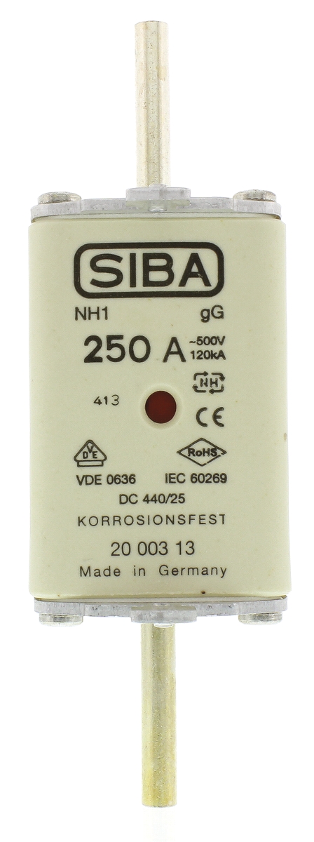 This is 250A 1 NH Centred Tag Fuse gG - gL 500V ac manufactured by SIBA. The manufacturer part number is 4184219. It has a blade type tag . The product has a gg - gl application category. The product has a current rating of 250a. Moreover, the product has a nominal 500v ac voltage rating. A fuse with a nh1 size. Moreover, its tag orientation is centred . Moreover, it has a high rupture capacity yes . The fuse complies with din 43620, vde 0636 standards.