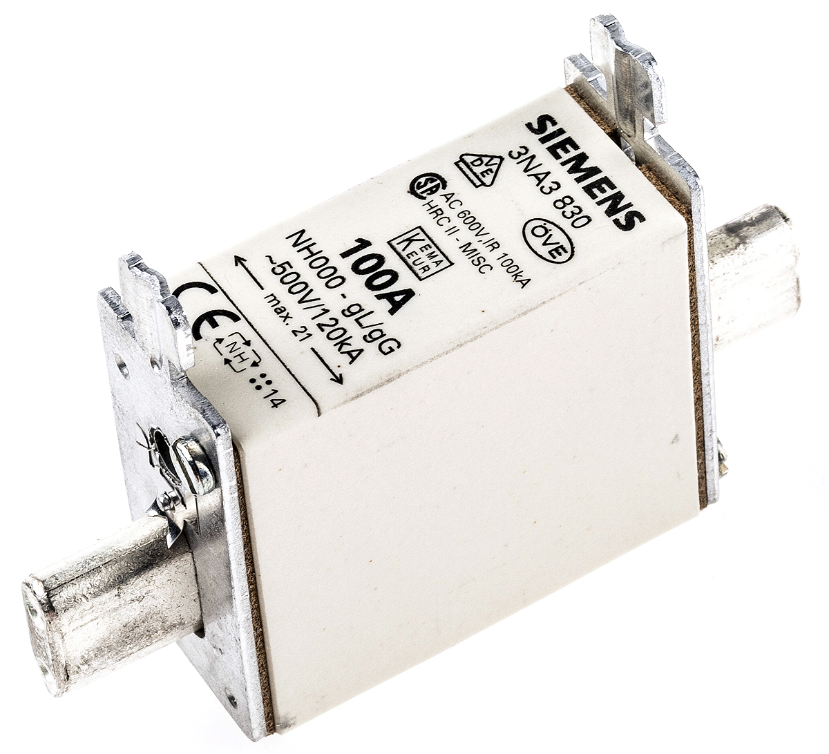 This is 100A 000 NH Centred Tag Fuse gG 500V ac manufactured by Siemens. The manufacturer part number is 3NA3830. It has a blade type tag . The product has a gg application category. The product has a current rating of 100a. Moreover, the product has a nominal 500v ac voltage rating. The product 3na3, is a highly preferred choice for users. A fuse with a nh000 size. It has an overall length of 77.8mm. Moreover, its tag orientation is centred . Its body length is 49.7mm. Moreover, it has a high rupture capacity yes . The fuse complies with csa 22.2, iec en 60269, vde 0636 standards. Its overall body width is 21mm .