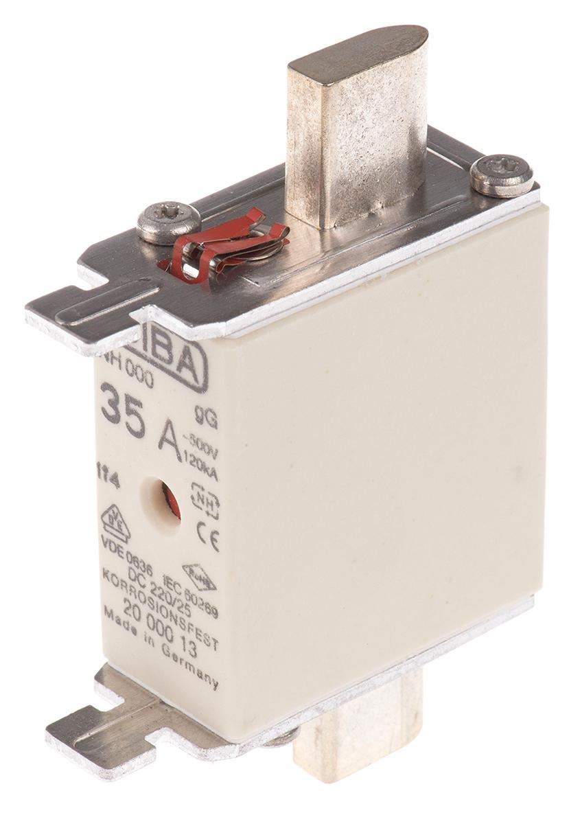 This is 35A 000 NH Centred Tag Fuse gG 500V ac manufactured by SIBA. The manufacturer part number is 20-000-13/35E1. It has a blade type tag . The product has a gg application category. The product has a current rating of 35a. The fuse dimensions of the product is 54 x 20.5 x 40.5mm . Moreover, the product has a nominal 500v ac voltage rating. A fuse with a nh000 size. It has an overall length of 78mm. Its tag is 6mm wide . Moreover, its tag orientation is centred . Its body length is 54mm. The fuse has a robust ff speed. Its body height is 40.5mm. The fuse complies with iec 60269-2-1 standards. Moreover, it has a high rupture capacity yes . Its overall body width is 20.5mm .