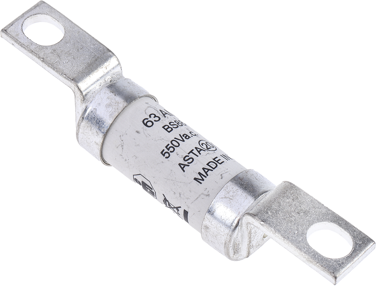 This is 63A A4 British Standard Fuse gG 550V ac manufactured by RS Pro. The manufacturer part number is 521-2680. It has a bolted type tag . Concerning body diameter, it is 21mm. The product has a gg application category. The product has a current rating of 63a. The fuse dimensions of the product is 21 x 58mm . Moreover, the product has a nominal 550v ac voltage rating. The product ceo, is a highly preferred choice for users. A fuse with a a4 size. It has a typical 94mm fixing centres . Its tag is 14.3mm wide . It has an overall length of 109.5mm. Moreover, its tag orientation is offset . Its body length is 58mm. Moreover, it has a high rupture capacity yes . Its body height is 21mm. The fuse complies with bs 88, iec 269 standards. Its overall body width is 21mm .