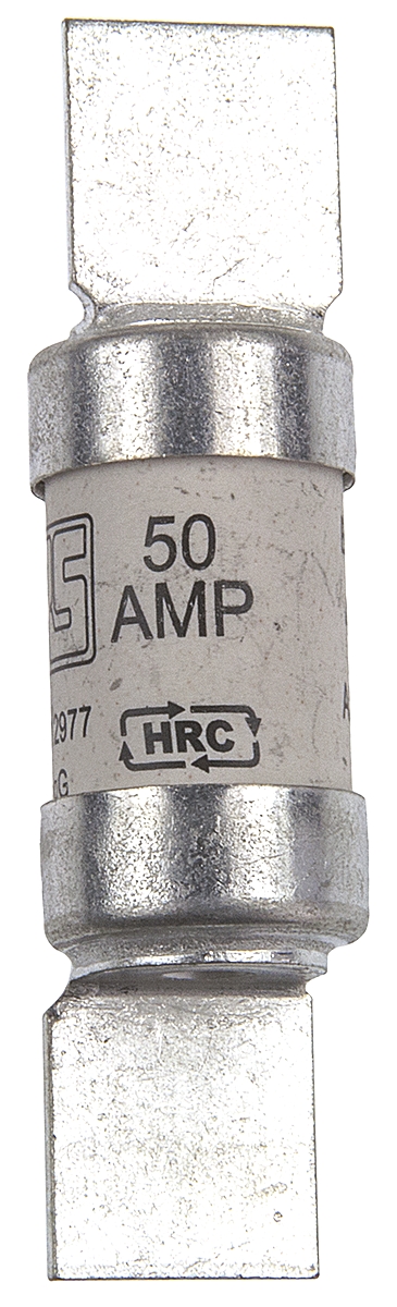 This is 50A F2 British Standard Fuse gG 415V ac HRC manufactured by RS Pro. The manufacturer part number is 521-2977. It has a blade type tag . Concerning body diameter, it is 17.5mm. The product has a gg application category. The product has a current rating of 50a. The fuse dimensions of the product is 17.5 x 67mm . Moreover, the product has a nominal 415v ac voltage rating. The product esd, is a highly preferred choice for users. A fuse with a f2 size. Its tag is 12.7mm wide . Its body length is 35.5mm. Moreover, it has a high rupture capacity yes . Its body height is 35.5mm. The fuse complies with bs 88, iec 269-1 standards. It has an overall length of 67mm.