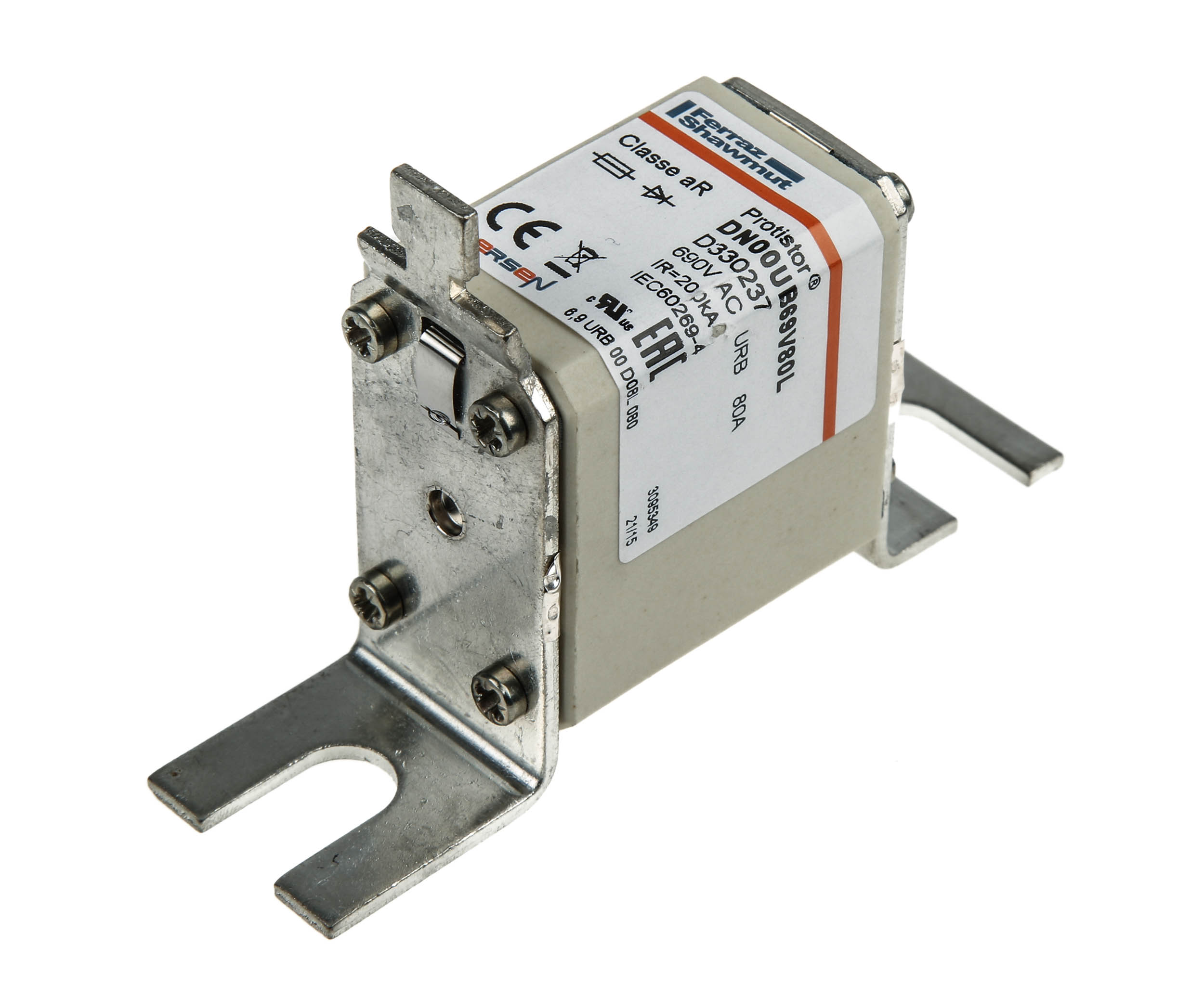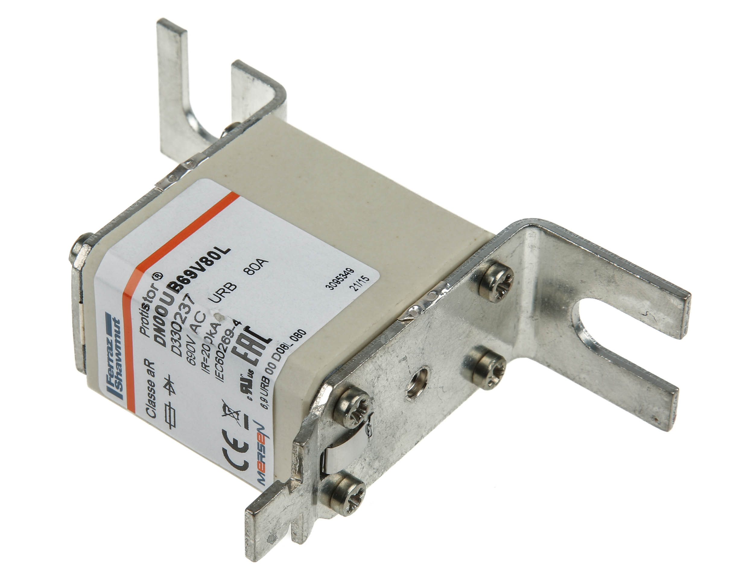 This is 80A 00 FF German Standard Fuse URB 690V ac manufactured by Mersen. The manufacturer part number is D330237. The product has a urb application category. The product has a current rating of 80a. Moreover, the product has a nominal 690v ac voltage rating. It has a typical 77mm fixing centres . A fuse with a nh00 size. It has an overall length of 100mm. Its tag is 26.5mm wide . Its body length is 54mm. The fuse has a robust ff speed. Its body height is 65mm. The fuse complies with din 80 standards. Its overall body width is 30mm .
