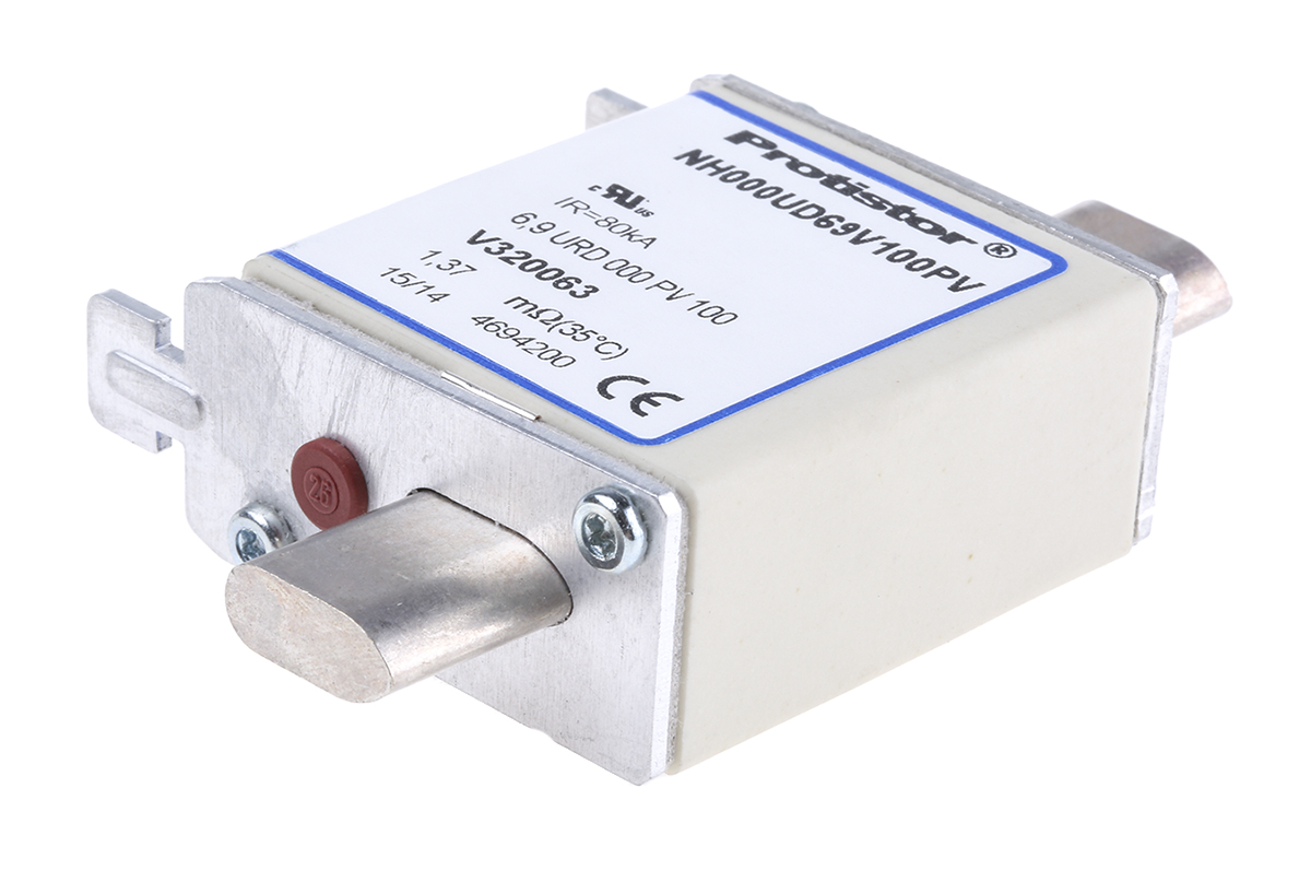 This is 100A 000 FF NH Centred Tag Fuse aR 690V ac manufactured by Mersen. The manufacturer part number is V320063. The product has a ar application category. The product has a current rating of 100a. The fuse dimensions of the product is 49.5 x 20.8 x 40.5mm . Moreover, the product has a nominal 690v ac voltage rating. A fuse with a nh000 size. It has an overall length of 79mm. Its tag is 6mm wide . Its body length is 49.5mm. The fuse has a robust ff speed. Its body height is 40.5mm. The fuse complies with iec 269.4, iec 60269-4 standards. Moreover, it has a high rupture capacity yes . Its overall body width is 20.8mm .