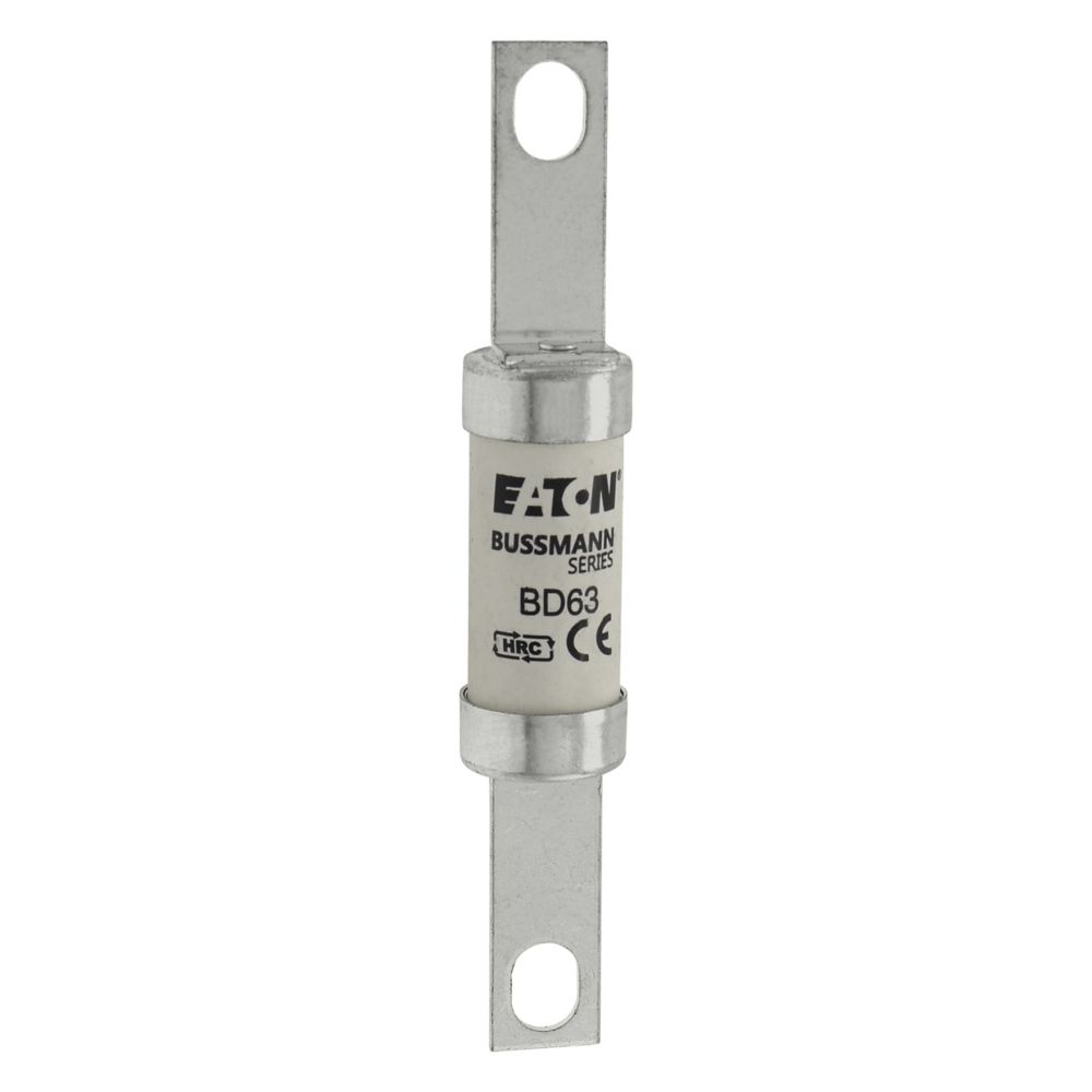 This is Cooper Bussmann 63A Bolted Tag Fuse 250 V dc 550 V ac 111mm manufactured by Eaton Bussmann Series. The manufacturer part number is BD63. It has a bolted type tag . Concerning body diameter, it is 21mm. The product has a gg application category. The product has a current rating of 63a. The fuse dimensions of the product is 21 x 55mm . Moreover, the product has a nominal 250 v dc, 500v ac voltage rating. The product bd, is a highly preferred choice for users. It has an overall length of 128.5mm. It has a typical 111mm fixing centres . Its tag is 14.2mm wide . Moreover, its tag orientation is centred . Its body length is 55mm. Moreover, it has a high rupture capacity yes . The fuse complies with bs88, iec 60269 standards.