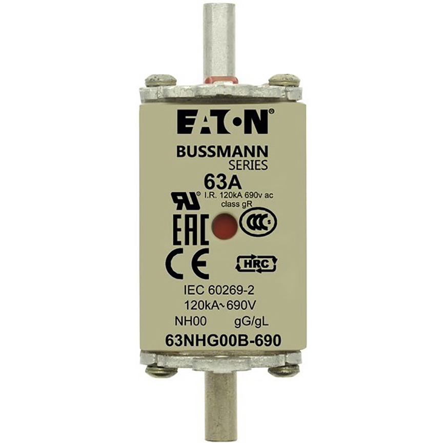 This is Cooper Bussmann 63A 00 NH Centred Tag Fuse gG 690V ac manufactured by Eaton Bussmann Series. The manufacturer part number is 63NHG00B-690. The product has a gg application category. The product has a current rating of 63a. The fuse dimensions of the product is 47.8 x 29.55 x 49.7mm . Moreover, the product has a nominal 690v ac voltage rating. The product nhg, is a highly preferred choice for users. A fuse with a 00 size. It has an overall length of 78.5mm. Its tag is 6mm wide . Its body length is 47.8mm. Its body height is 49.7mm. The fuse complies with din 43620, iec 60269 standards. Its overall body width is 29.55mm .
