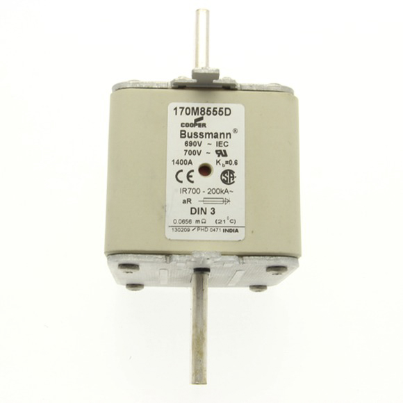This is Cooper Bussmann 1.4kA 3 HSDI Centred Tag Fuse aR 690V ac manufactured by Eaton Bussmann Series. The manufacturer part number is 170M8555D. It has a blade type tag . The product has a ar application category. The product has a current rating of 1.4ka. The fuse dimensions of the product is 87 x 71 x 68mm . Moreover, the product has a nominal 690v ac voltage rating. A fuse with a 3 size. It has an overall length of 150mm. Its tag is 32mm wide . Its body length is 87mm. Its body height is 68mm. The fuse complies with ce, csa, iec 60269, ul standards. Its overall body width is 71mm .