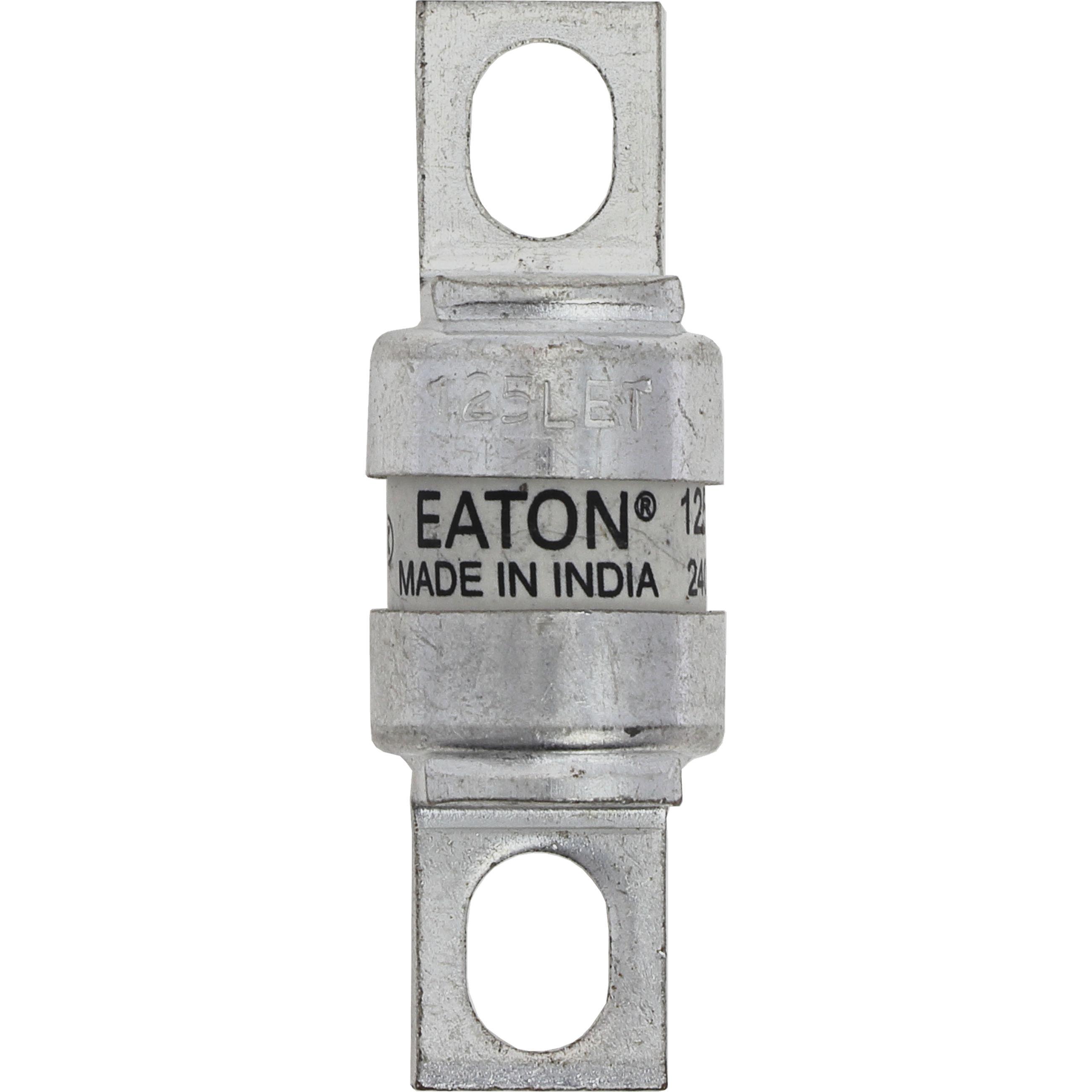This is Cooper Bussmann 125A Bolted Tag Fuse LET 150 V dc 240 V ac 41.8mm manufactured by Eaton Bussmann Series. The manufacturer part number is 125LET. It has a bolted type tag . Concerning body diameter, it is 17.7mm. The product has a ar application category. The product has a current rating of 125a. The fuse dimensions of the product is 17.7 x 26.2mm . Moreover, the product has a nominal 150 v dc, 240v ac voltage rating. The product let, is a highly preferred choice for users. A fuse with a let size. It has a typical 41.8mm fixing centres . Its tag is 12.7mm wide . Moreover, its tag orientation is offset . Its body length is 26.2mm. Moreover, it has a high rupture capacity yes . Its body height is 19.1mm. The fuse complies with bs 88, iec 269-4 standards. It has an overall length of 56mm.