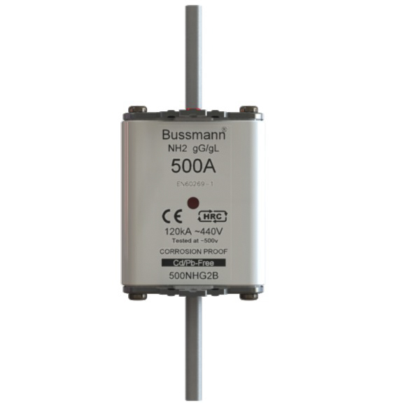 This is Cooper Bussmann 500A 2 NH Centred Tag Fuse 440V ac manufactured by Eaton Bussmann Series. The manufacturer part number is 500NHG2B. The product has a current rating of 500a. The fuse dimensions of the product is 61 x 53.9 x 68.5mm . Moreover, the product has a nominal 440v ac voltage rating. A fuse with a 2 size. It has an overall length of 150mm. Its tag is 25.1mm wide . Moreover, its tag orientation is square . Its body length is 61mm. Its body height is 68.5mm. The fuse complies with ce, din 43620, iec 60269, vde 0636 standards. Its overall body width is 53.9mm .