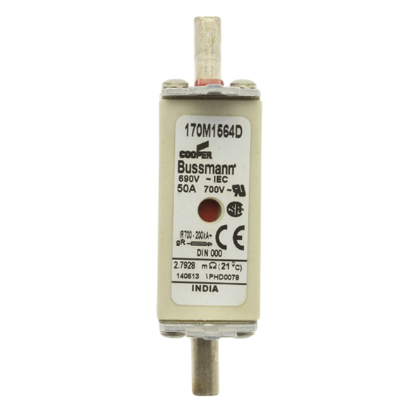 This is Cooper Bussmann 50A 000 T HSDI Centred Tag Fuse gR 690V ac manufactured by Eaton Bussmann Series. The manufacturer part number is 170M1564D. It has a blade type tag . The product has a gr application category. The product has a current rating of 50a. The fuse dimensions of the product is 52 x 20.5 x 49.7mm . Moreover, the product has a nominal 690v ac voltage rating. A fuse with a 000 size. It has an overall length of 78.5mm. Its tag is 15mm wide . Its body length is 52mm. The fuse has a robust t speed. Its body height is 49.7mm. The fuse complies with ce, csa, iec 60269, ul standards. Its overall body width is 20.5mm .