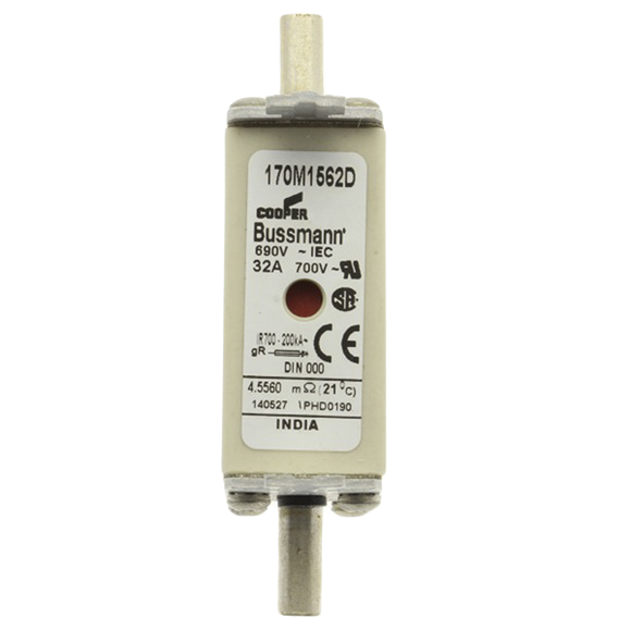 This is Cooper Bussmann 32A 000 T HSDI Centred Tag Fuse gR 690V ac manufactured by Eaton Bussmann Series. The manufacturer part number is 170M1562D. It has a blade type tag . The product has a gr application category. The product has a current rating of 32a. The fuse dimensions of the product is 52 x 20.5 x 49.7mm . Moreover, the product has a nominal 690v ac voltage rating. A fuse with a 000 size. It has an overall length of 78.5mm. Its tag is 15mm wide . Its body length is 52mm. The fuse has a robust t speed. Its body height is 49.7mm. The fuse complies with ce, csa, iec 60269, ul standards. Its overall body width is 20.5mm .