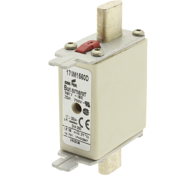 This is Cooper Bussmann 20A 000 T HSDI Centred Tag Fuse gR 690V ac manufactured by Eaton Bussmann Series. The manufacturer part number is 170M1560D. It has a blade type tag . The product has a gr application category. The product has a current rating of 20a. The fuse dimensions of the product is 52 x 20.5 x 49.7mm . Moreover, the product has a nominal 690v ac voltage rating. A fuse with a 000 size. It has an overall length of 78.5mm. Its tag is 15mm wide . Its body length is 52mm. The fuse has a robust t speed. Its body height is 49.7mm. The fuse complies with ce, csa, iec 60269, ul standards. Its overall body width is 20.5mm .