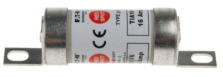 This is Cooper Bussmann 16A British Standard Fuse A2 660V ac 73mm manufactured by Eaton Bussmann Series. The manufacturer part number is TIA16. It has a bolted type tag . Concerning body diameter, it is 22.2mm. The product has a gg application category. The product has a current rating of 16a. The fuse dimensions of the product is 22 x 86mm . Moreover, the product has a nominal 660v ac voltage rating. It has a typical 73mm fixing centres . A fuse with a a2 size. Its tag is 8.7mm wide . Moreover, its tag orientation is offset . The fuse has a robust t speed. Its body height is 56.4mm. The fuse complies with bs 88-2, iec 269-2 standards. Moreover, it has a high rupture capacity yes . It has an overall length of 85.5mm.