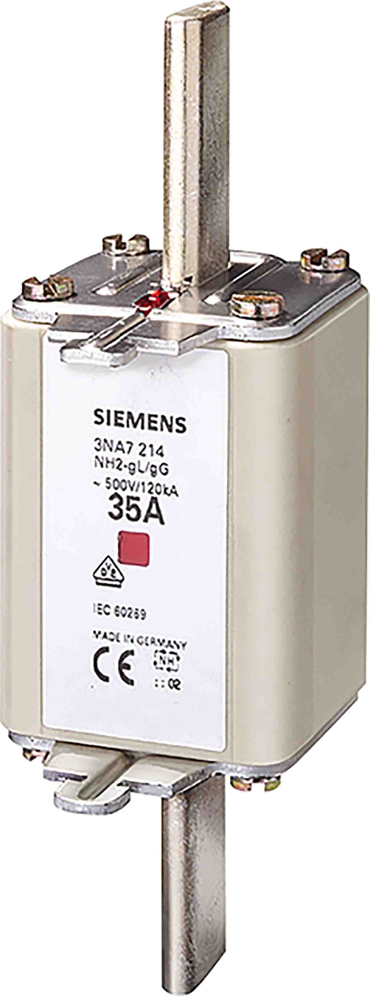 This is 315A NH2 Fast Acting Fuse HRC Centred Tag Fuse gG 500V ac manufactured by Siemens. The manufacturer part number is 3NA7252. It has a blade type tag . The product has a gg application category. The product has a current rating of 315a. Moreover, the product has a nominal 500v ac voltage rating. A fuse with a nh2 size. It has an overall length of 147.6mm. Moreover, its tag orientation is centred . Its body length is 72.4mm. The fuse has a robust f speed. The fuse complies with iec 60269 standards. Its overall body width is 57mm .