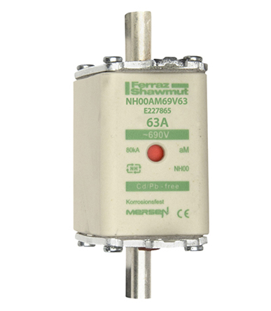 This is 63A NH Fuse 00 690V ac manufactured by Mersen. The manufacturer part number is E227865-RS. It has a blade type tag . The product has a am application category. The product has a current rating of 63a. Moreover, the product has a nominal 690v ac voltage rating. A fuse with a nh00 size. It has an overall length of 78.5mm. Its tag is 15mm wide . Moreover, its tag orientation is centred . Its body length is 49mm. Its body height is 60mm. The fuse complies with din 43-620, iec en 60269, vde 0636 standards. Its overall body width is 30mm .