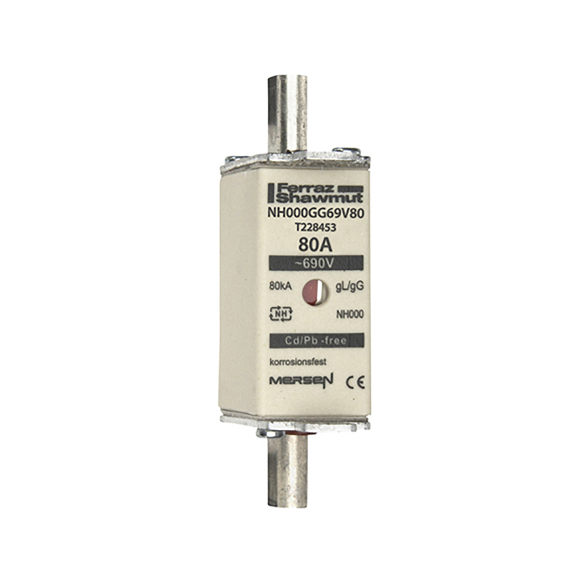 This is 80A NH Fuse NH 000 690V ac manufactured by Mersen. The manufacturer part number is T228453. The product has a current rating of 80a. A fuse with a nh000 size. The fuse has a robust gg speed. Moreover, the product has a nominal 690v ac voltage rating.