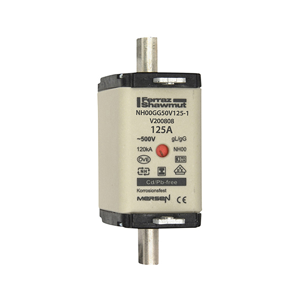 This is 125A NH Fuse NH 00 500V ac manufactured by Mersen. The manufacturer part number is V200808. The product has a current rating of 125a. A fuse with a nh00 size. The fuse has a robust gg speed. Moreover, the product has a nominal 500v ac voltage rating.