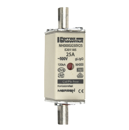 This is 25A NH Fuse NH000 500V ac manufactured by Mersen. The manufacturer part number is E201185C / NH000GG50V25/3. It has a blade type tag . The product has a gg application category. The product has a current rating of 25a. Moreover, the product has a nominal 500v ac voltage rating. A fuse with a nh000 size. It has an overall length of 78.5mm. Its tag is 15mm wide . Moreover, its tag orientation is centred . Its body length is 49mm. Its body height is 53mm. The fuse complies with din 43 620, iec 60269-1 and -2, vde 0636 part 201 standards. Its overall body width is 21mm .