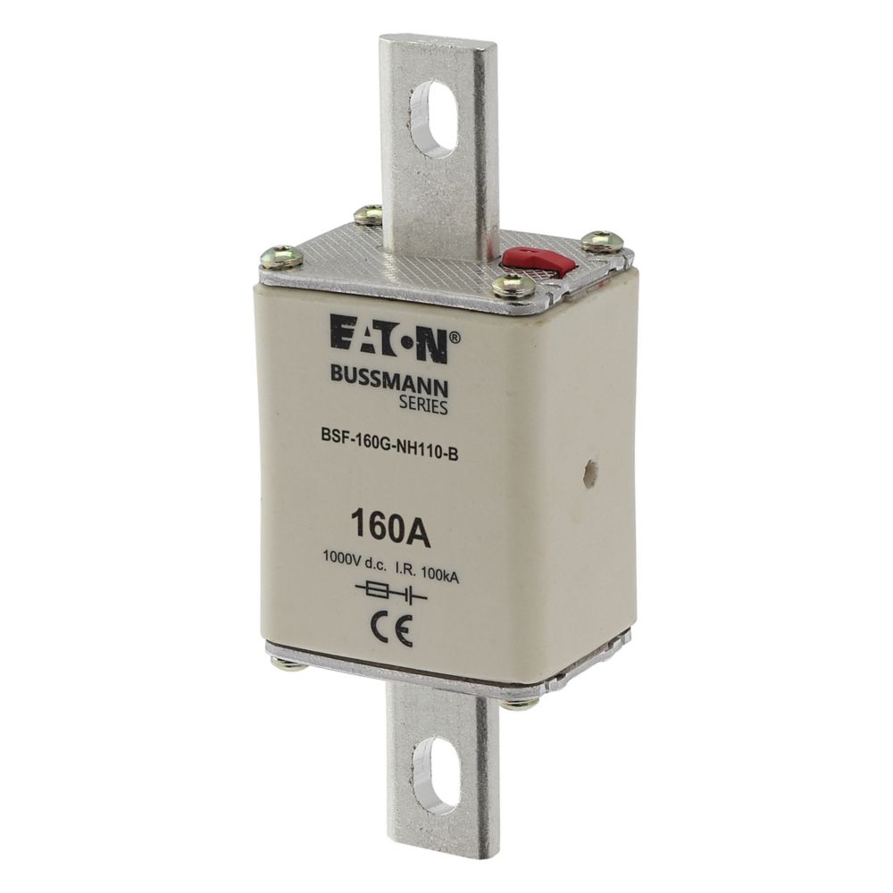 This is 160A Tag Fuse NH1 1kV manufactured by Eaton. The manufacturer part number is BSF-160G-NH110-B. Moreover, the product has a nominal 1kv voltage rating. A fuse with a nh1 size. The product has a current rating of 160a. The fuse complies with iec 60269-7 standards.