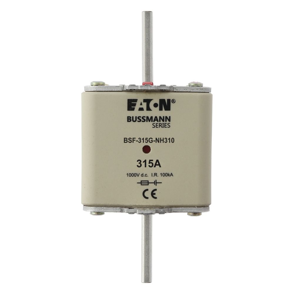 This is 315A Tag Fuse NH3 1kV manufactured by Eaton. The manufacturer part number is BSF-315G-NH310. Moreover, the product has a nominal 1kv voltage rating. A fuse with a nh3 size. The product has a current rating of 315a. The fuse complies with iec 60269-7 standards.