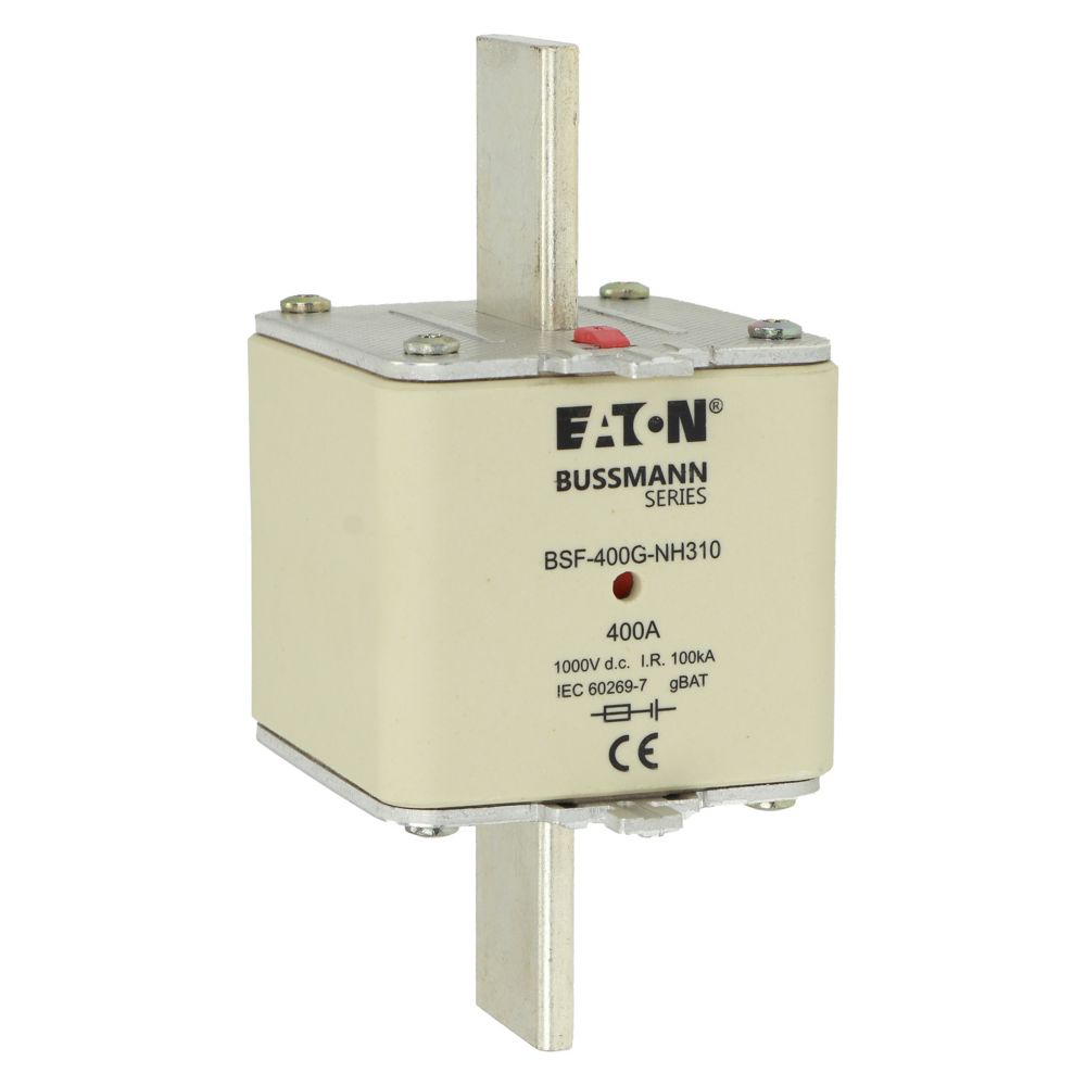 This is 400A Tag Fuse NH3 1kV manufactured by Eaton. The manufacturer part number is BSF-400G-NH310. Moreover, the product has a nominal 1kv voltage rating. A fuse with a nh3 size. The product has a current rating of 400a. The fuse complies with iec 60269-7 standards.