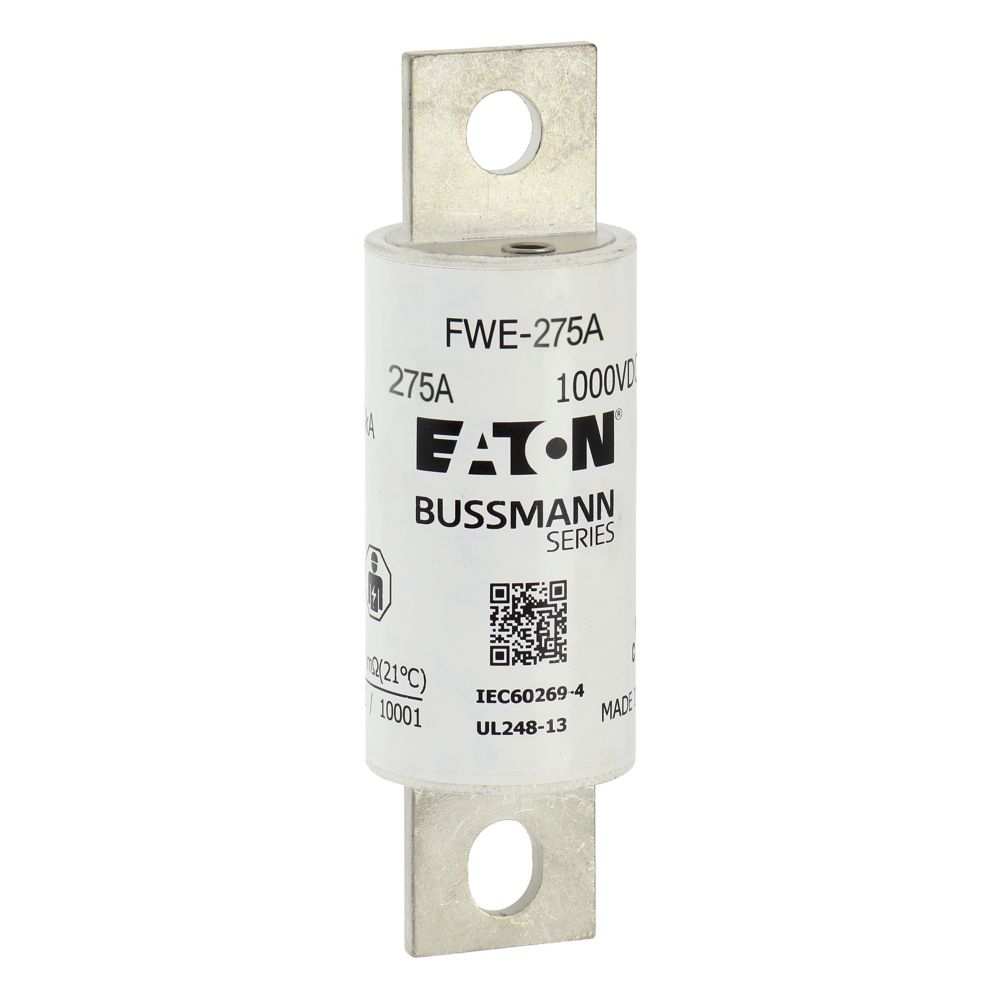 This is 275A Tag Fuse 40mm 1kV manufactured by Eaton. The manufacturer part number is FWE-275A. It has a bolted type tag . The product has a current rating of 275a. Moreover, the product has a nominal 1kv voltage rating. The product fwe, is a highly preferred choice for users. A fuse with a 40mm size. The fuse complies with ce, iec 60269-4 standards.