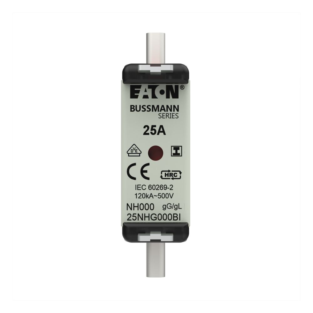 This is 25A Tag Fuse 21 x 79mm 500V manufactured by Eaton. The manufacturer part number is 25NHG000BI NH FUSE 25A 500V SIZE 000 GG IMGL. Moreover, the product has a nominal 500v voltage rating. A fuse with a 21 x 79mm size. The product has a current rating of 25a. The fuse complies with iec standards.