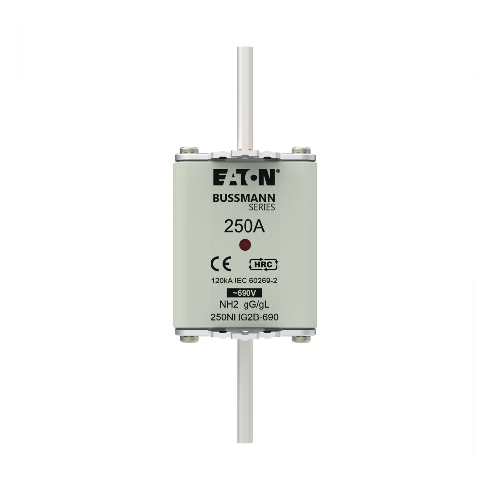 This is 250A NH Fuse 71 x 54 x 150mm 690V ac manufactured by Eaton. The manufacturer part number is 250NHG2B-690 NH FUSE 250A 690V gG SIZE 2. Moreover, the product has a nominal 690v ac voltage rating. A fuse with a 71 x 54 x 150mm size. The product has a current rating of 250a. The fuse complies with gl/gg standards.
