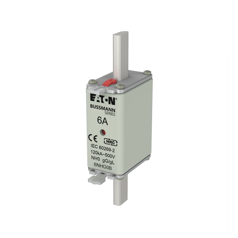 This is 6A NH Fuse 58 x 30 x 125mm 500V ac manufactured by Eaton. The manufacturer part number is 6NHG0B NH FUSE 6A 500V GG/GL SIZE 0. Moreover, the product has a nominal 500v ac voltage rating. A fuse with a 58 x 30 x 125mm size. The product has a current rating of 6a. The fuse complies with gl/gg standards.