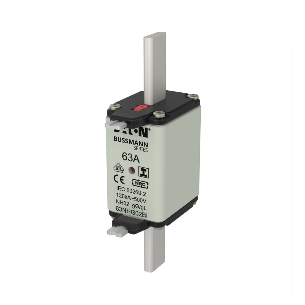 This is 63A NH Fuse 63 x 40 x 150mm 500V ac manufactured by Eaton. The manufacturer part number is 63NHG02BI NH FUSE 63A 500V GL/GG SIZE 02. Moreover, the product has a nominal 500v ac voltage rating. A fuse with a 63 x 40 x 150mm size. The product has a current rating of 63a. The fuse complies with gl/gg standards.