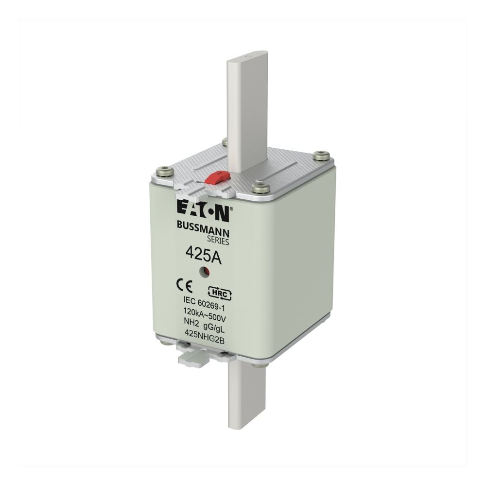 This is 425A NH Fuse 71 x 54 x 150mm 500V ac manufactured by Eaton. The manufacturer part number is 425NHG2B NH FUSE 425A 500V GG/GL SIZE 2. Moreover, the product has a nominal 500v ac voltage rating. A fuse with a 71 x 54 x 150mm size. The product has a current rating of 425a. The fuse complies with gl/gg standards.