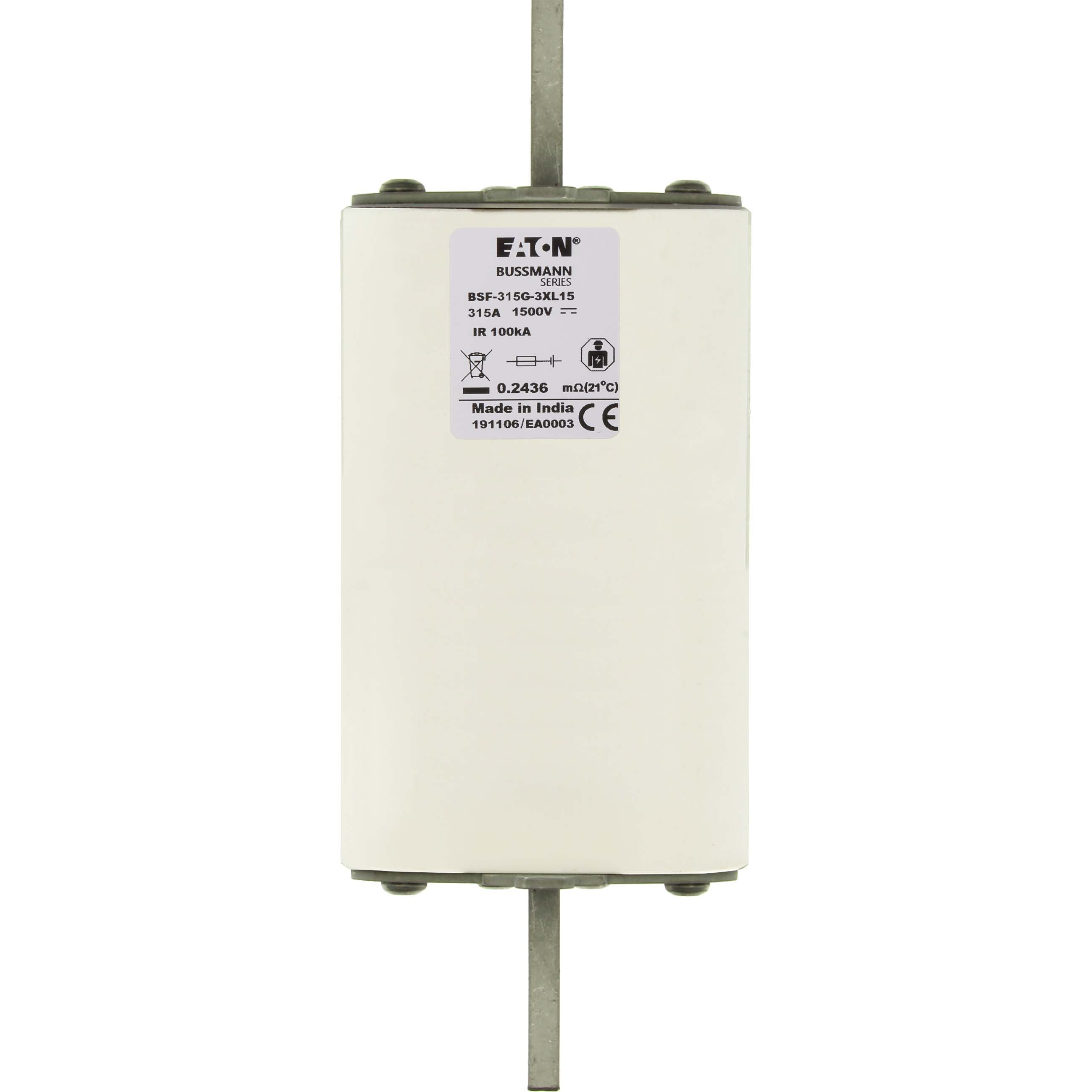 This is FUSE 315A 1500V 3L BSF BLADE END manufactured by Eaton. The manufacturer part number is BSF-315G-3XL15. The product has a current rating of 315a. Moreover, the product has a nominal 1.5kv voltage rating. It has a typical 205mm fixing centres . A fuse with a 3l size. The fuse complies with iec 60269-7 standards.