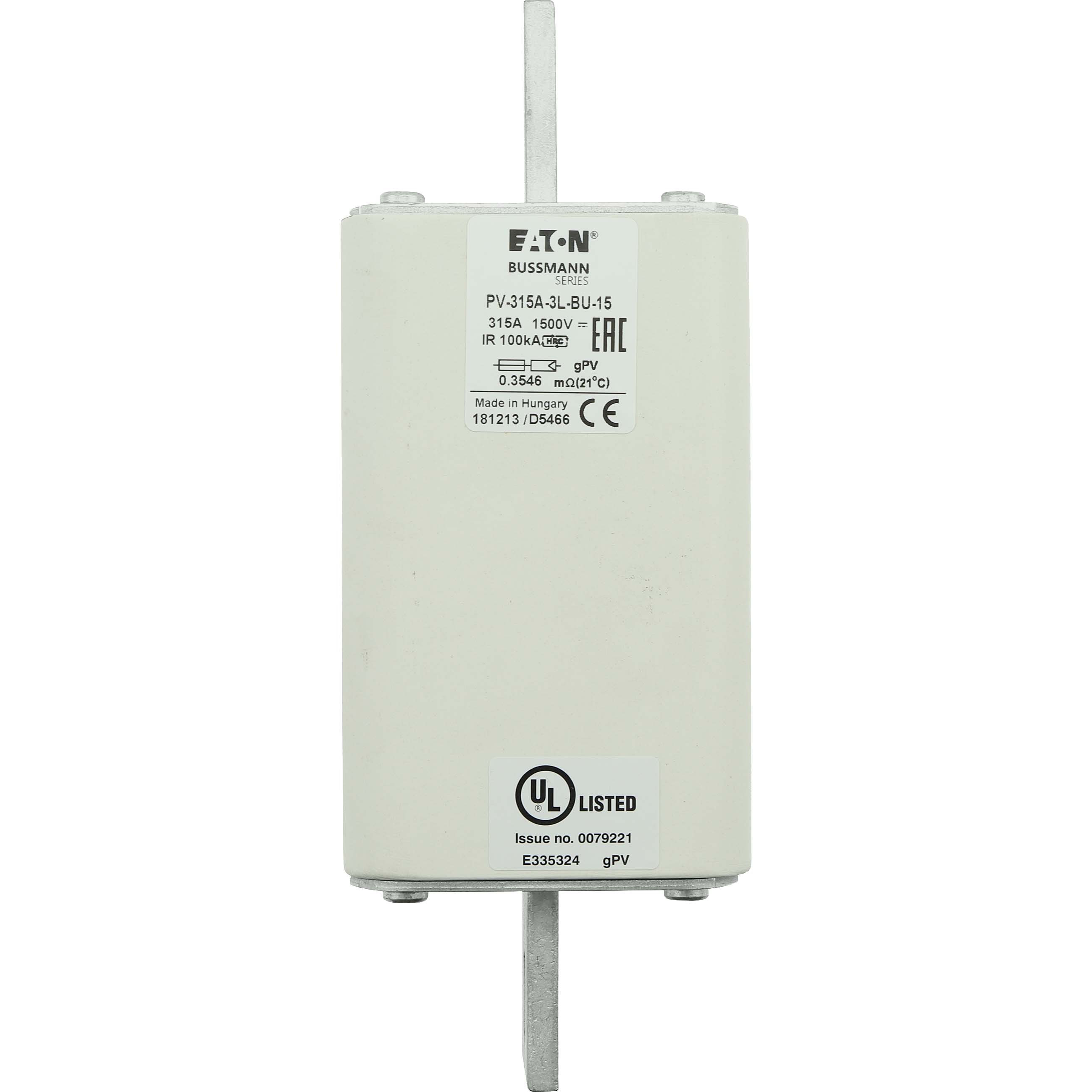 This is FUSE 315A 1500V 3L PV BOLT-IN VER manufactured by Eaton. The manufacturer part number is PV-315A-3L-BU-15. Is it a better world product? yes. The product has a current rating of 315a. Moreover, the product has a nominal 1.5kv voltage rating. It has a typical 170mm fixing centres . A fuse with a 3l size. The fuse complies with iec 60269-6 standards.
