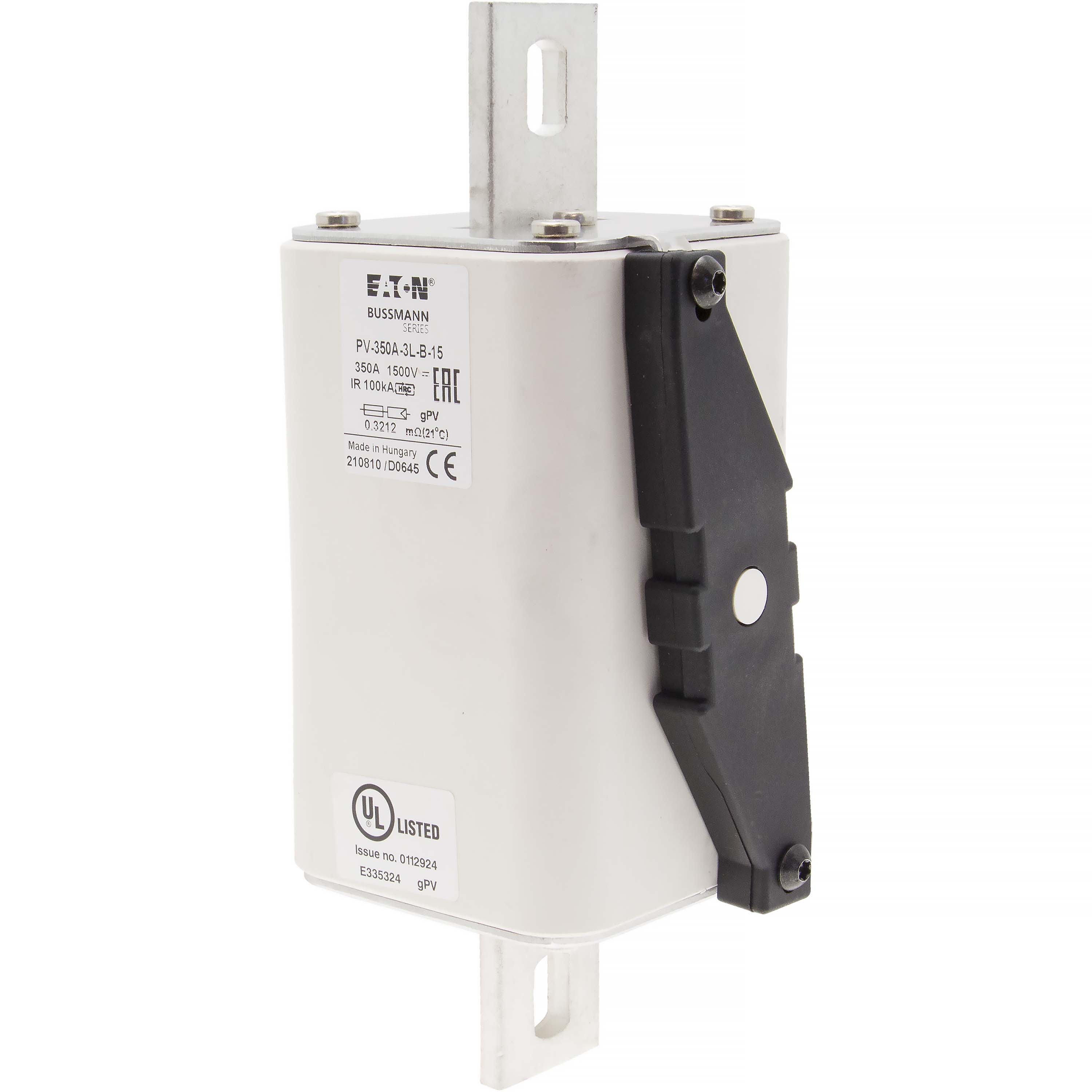 This is FUSE 350A 1500V 3L gPV BOLT-IN VER manufactured by Eaton. The manufacturer part number is PV-350A-3L-B-15. Is it a better world product? yes. Moreover, the product has a nominal 1.5kv voltage rating. It has a typical 170mm fixing centres . A fuse with a 3l size. The fuse complies with iec 60269-6 standards. The product has a current rating of 350a.