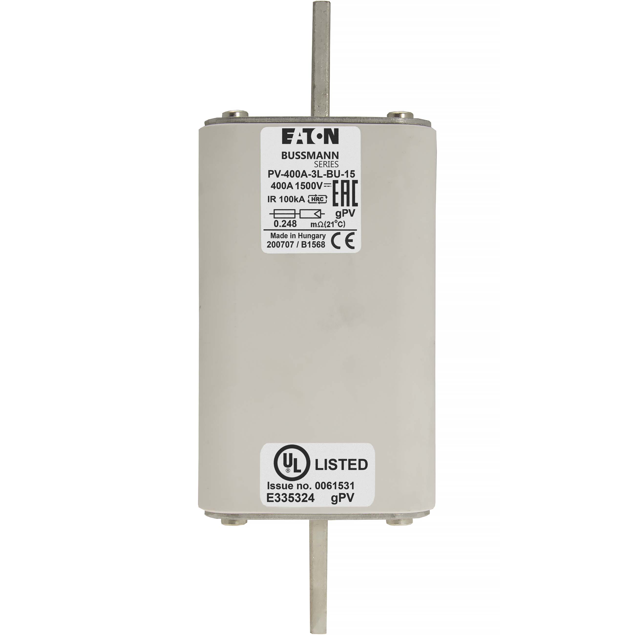 This is FUSE 400A 1500V 3L PV BOLT-IN VER manufactured by Eaton. The manufacturer part number is PV-400A-3L-BU-15. Is it a better world product? yes. Moreover, the product has a nominal 1.5kv voltage rating. It has a typical 170mm fixing centres . A fuse with a 3l size. The fuse complies with iec 60269-6 standards. The product has a current rating of 400a.