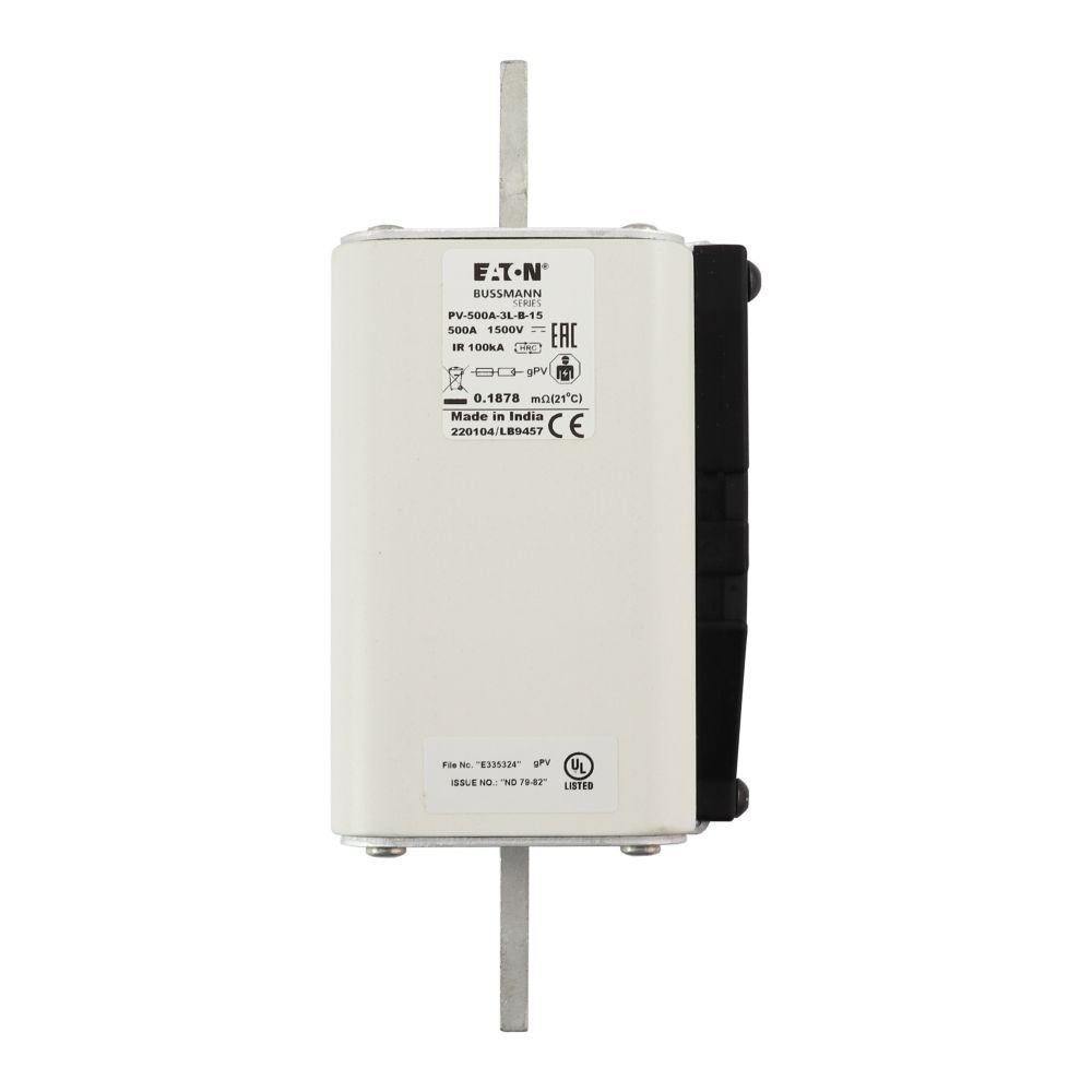 This is FUSE 500A 1500V 3L PV BOLT-IN VER manufactured by Eaton. The manufacturer part number is PV-500A-3L-B-15. Is it a better world product? yes. Moreover, the product has a nominal 1.5kv voltage rating. It has a typical 170mm fixing centres . A fuse with a 3l size. The fuse complies with iec 60269-6 standards. The product has a current rating of 500a.