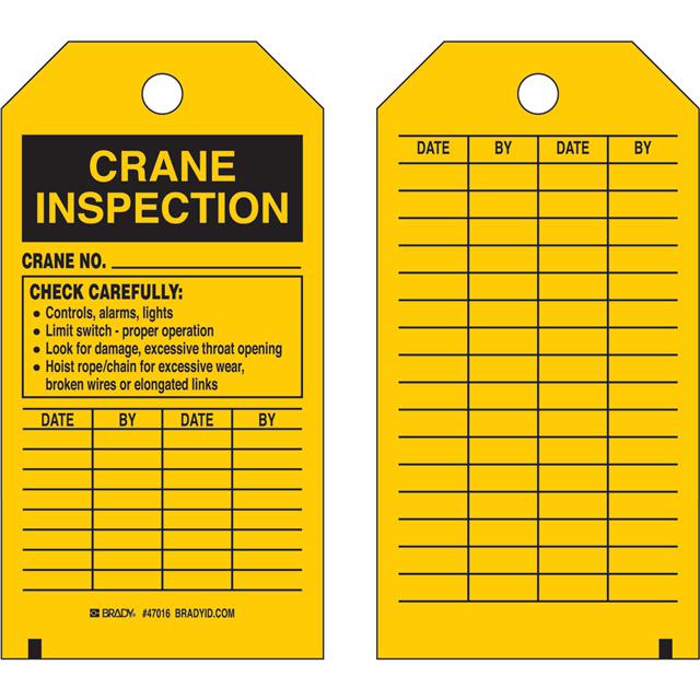 This is manufactured by Brady Corporation. The manufacturer part number is 47016. Label with a size of 5.75" l x 3.00" w (146.0mm x 76.2mm). The product is not applicable. It has a classic black legend, yellow background colour. The product brady®, is a highly preferred choice for users. The product is made from highly stable and reliable polyester. In addition, it is reach unaffected. Its typical moisture sensitivity level is not applicable. In addition, bulk is the available packaging type of the product. A bespoke label is a crane inspection. crane no. check carefully label. It has a long 4 weeks standard lead time. The brady corporation's product offers user-desired applications.