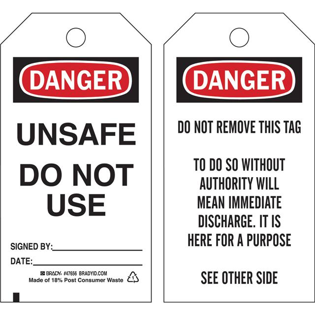 This is manufactured by Brady Corporation. The manufacturer part number is 47656. Label with a size of 5.75" l x 3.00" w (146.0mm x 76.2mm). The product is not applicable. It is shipped in bulk package . It has a classic black and red legend, white background colour. The product brady®, is a highly preferred choice for users. The product is made from highly stable and reliable polyester. In addition, it is reach unaffected. Its typical moisture sensitivity level is not applicable. A bespoke label is a danger. unsafe do not use signed by. date. label. The product is suitable for use with danger. It has a long 4 weeks standard lead time.