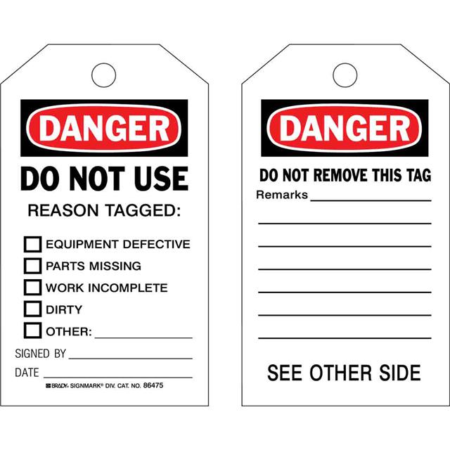 This is manufactured by Brady Corporation. The manufacturer part number is 86475. Label with a size of 7.00" l x 4.00" w (177.8mm x 101.6mm). The product is rohs3 compliant. It is shipped in bulk package . It has a classic black and red legend, white background colour. The product brady®, is a highly preferred choice for users. The product is made from highly stable and reliable polyester. In addition, it is reach unaffected. Its typical moisture sensitivity level is not applicable. A bespoke label is a do not use reason tagged. equipment defective. parts missing. work incomplete. dirty. other signed by. date, do not remove thi… label. It has a long 4 weeks standard lead time.