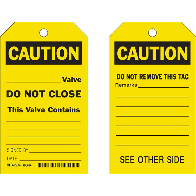 This is manufactured by Brady Corporation. The manufacturer part number is 86494. Label with a size of 7.00" l x 4.00" w (177.8mm x 101.6mm). The product is rohs3 compliant. It has a classic black legend, yellow background colour. The product brady®, is a highly preferred choice for users. The product is made from highly stable and reliable polyester. In addition, it is vendor undefined. Its typical moisture sensitivity level is not applicable. In addition, bulk is the available packaging type of the product. A bespoke label is a caution. valve do not close this valve contains. signed by. date. label. The product is suitable for use with caution. It has a long 4 weeks standard lead time. The brady corporation's product offers user-desired applications.