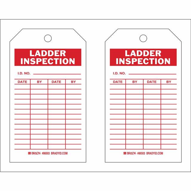 This is manufactured by Brady Corporation. The manufacturer part number is 86503. Label with a size of 7.00" l x 4.00" w (177.8mm x 101.6mm). The product is rohs3 compliant. It has a classic red legend, white background colour. The product brady®, is a highly preferred choice for users. The product is made from highly stable and reliable polyester. In addition, it is reach unaffected. Its typical moisture sensitivity level is not applicable. In addition, bulk is the available packaging type of the product. A bespoke label is a ladder inspection. i.d. no. date. by. date. by. label. It has a long 4 weeks standard lead time. The brady corporation's product offers user-desired applications.