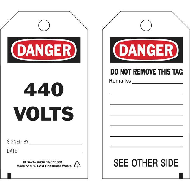 This is manufactured by Brady Corporation. The manufacturer part number is 86540. Label with a size of 5.75" l x 3.00" w (146.0mm x 76.2mm). The product is not applicable. It is shipped in bulk package . It has a classic black and red legend, white background colour. The product brady®, is a highly preferred choice for users. The product is made from highly stable and reliable polyester. In addition, it is reach unaffected. Its typical moisture sensitivity level is not applicable. A bespoke label is a danger. 440 volts signed by. date. label. The product is suitable for use with danger. It has a long 4 weeks standard lead time.