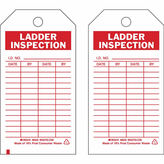 This is manufactured by Brady Corporation. The manufacturer part number is 86555. Label with a size of 5.75" l x 3.00" w (146.0mm x 76.2mm). The product is rohs3 compliant. It has a classic red legend, white background colour. The product brady®, is a highly preferred choice for users. The product is made from highly stable and reliable polyester. In addition, it is reach unaffected. Its typical moisture sensitivity level is not applicable. In addition, bulk is the available packaging type of the product. A bespoke label is a ladder inspection. i.d. no. date. by. date. by. label. It has a long 4 weeks standard lead time. The brady corporation's product offers user-desired applications.