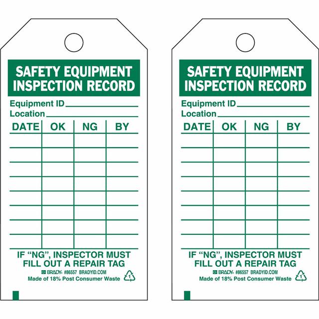 This is manufactured by Brady Corporation. The manufacturer part number is 86557. Label with a size of 5.75" l x 3.00" w (146.0mm x 76.2mm). The product is not applicable. It has a classic green legend, white background colour. The product brady®, is a highly preferred choice for users. The product is made from highly stable and reliable polyester. In addition, it is reach unaffected. Its typical moisture sensitivity level is not applicable. In addition, bulk is the available packaging type of the product. A bespoke label is a safety equipment inspection record. equipment id. location. date. ok. ng. by. if "ng", inspector must fill out a repair tag label. It has a long 4 weeks standard lead time. The brady corporation's product offers user-desired applications.