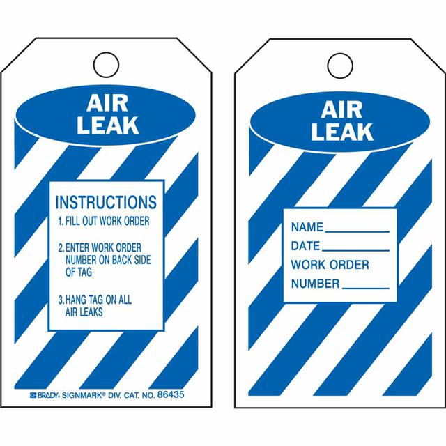 This is manufactured by Brady Corporation. The manufacturer part number is 86562. Label with a size of 5.75" l x 3.00" w (146.0mm x 76.2mm). The product is not applicable. It has a classic blue legend, white background colour. The product brady®, is a highly preferred choice for users. The product is made from highly stable and reliable polyester. In addition, it is reach unaffected. Its typical moisture sensitivity level is not applicable. In addition, bulk is the available packaging type of the product. A bespoke label is a instructions 1.fill out work order 2.enter work order number on back side of tag 3.hang tag on all air leaks, name. date. work order number. label. It has a long 4 weeks standard lead time. The brady corporation's product offers user-desired applications.