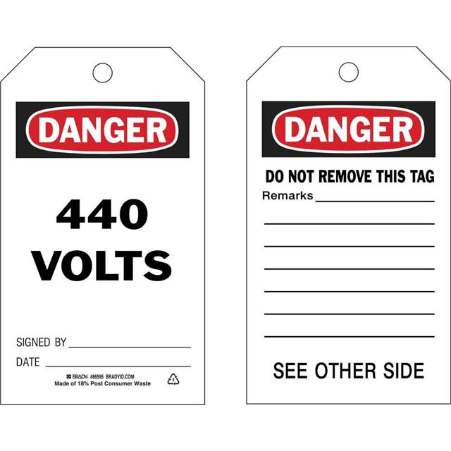 This is manufactured by Brady Corporation. The manufacturer part number is 86595. Label with a size of 7.00" l x 4.00" w (177.8mm x 101.6mm). The product is rohs3 compliant. It is shipped in bulk package . It has a classic black and red legend, white background colour. The product brady®, is a highly preferred choice for users. The product is made from highly stable and reliable polyester. In addition, it is reach unaffected. Its typical moisture sensitivity level is not applicable. A bespoke label is a danger. 440 volts signed by. date. label. The product is suitable for use with danger. It has a long 4 weeks standard lead time.